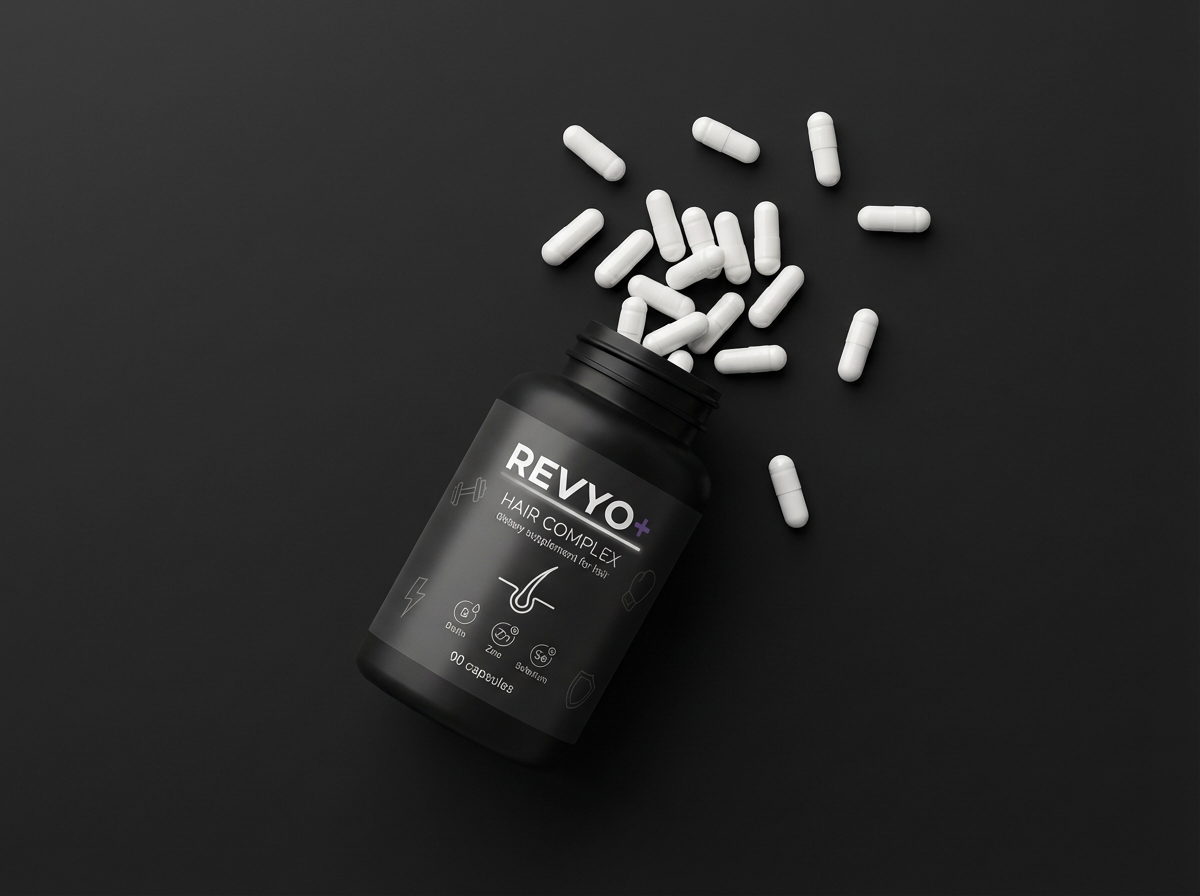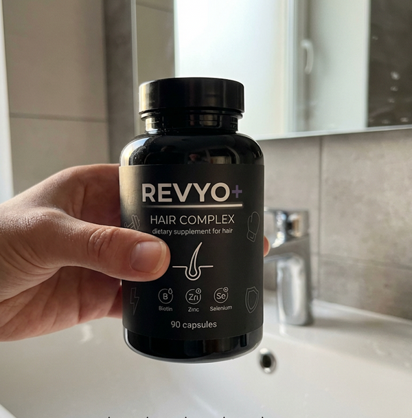 REVYO+ MEN DEFENSE DHT ULTRA spája silný rastlinný komplex so saw palmettom, extraktom z tekvicových semien, žihľavou a beta-sitosterolom, ktorý podporuje hormonálnu rovnováhu a zdravé prostredie vlasových folikulov. Zhruba 2/3 aktívnych látok tvoria tieto DHT-support extrakty, približne 1/3 tvoria sírne aminokyseliny L-cystín a L-metionín ako stavebné kamene keratínu a zvyšné percentá pripadajú na koncentrovaný mix zinku, biotínu, vitamínu D3, B6, folátu, B12 a medi. Spolu ide o vysoko nadupané zloženie zamerané na mužov, ktorí riešia rednutie vlasov, kúty a slabší objem.